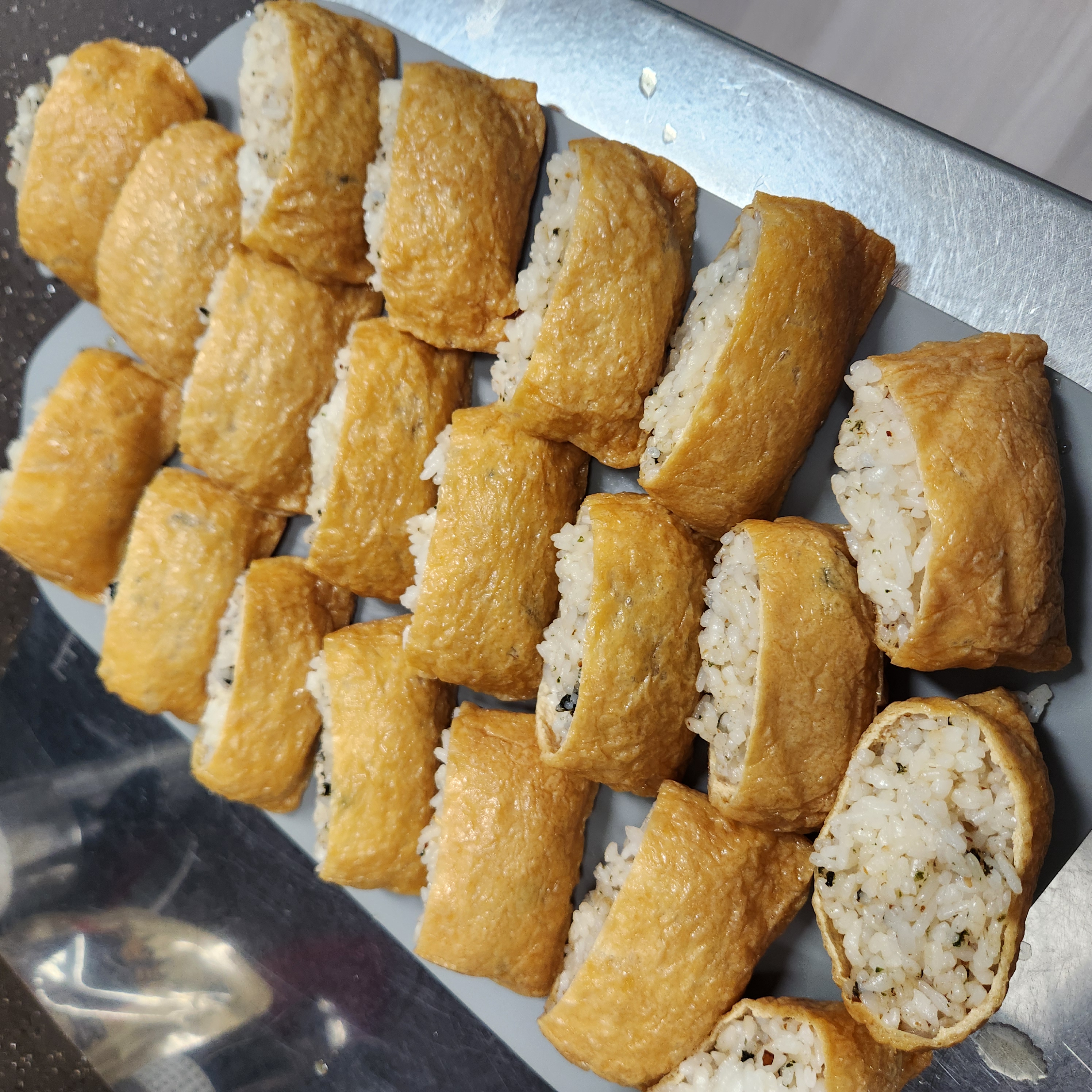 유부초밥은 원하는대로 네모로도, 세모로도 잘라 쓸수 있는데 유부 1개당 초밥 2개가 되는셈.